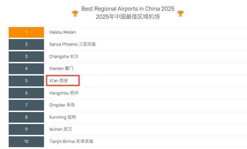 除航站楼建设的亮眼表现,西安咸阳国际机场在服务品质方面的升级也得到了Skytrax的认可。在2025年Skytrax中国区最佳区域机场评选中,西安咸阳国际机场位列全国第五,彰显了机场在服务提升、运营管理等方面的持续努力与显著成效。