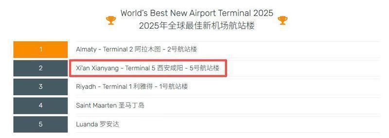 原标题:全球第二!西安咸阳国际机场T5航站楼上榜“全球最佳新机场航站楼”