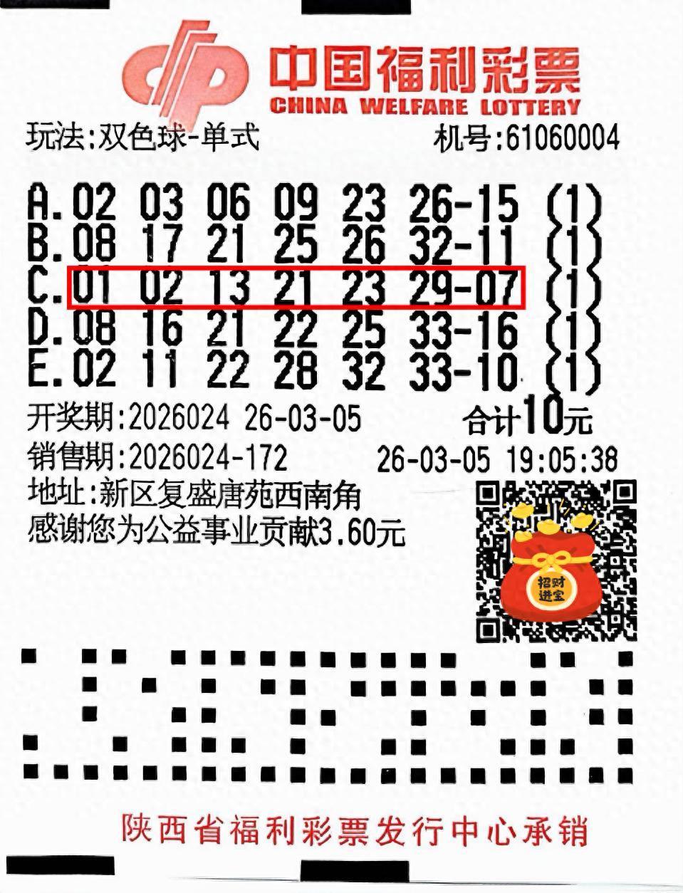 3月5日晚,福彩双色球第2026024期开奖结果揭晓,延安市新区复盛唐苑西南角福彩第61060004号投注站传来喜讯,彩民李先生(化姓)凭借一张10元单式票,收获到双色球二等奖1注,奖金843179元。