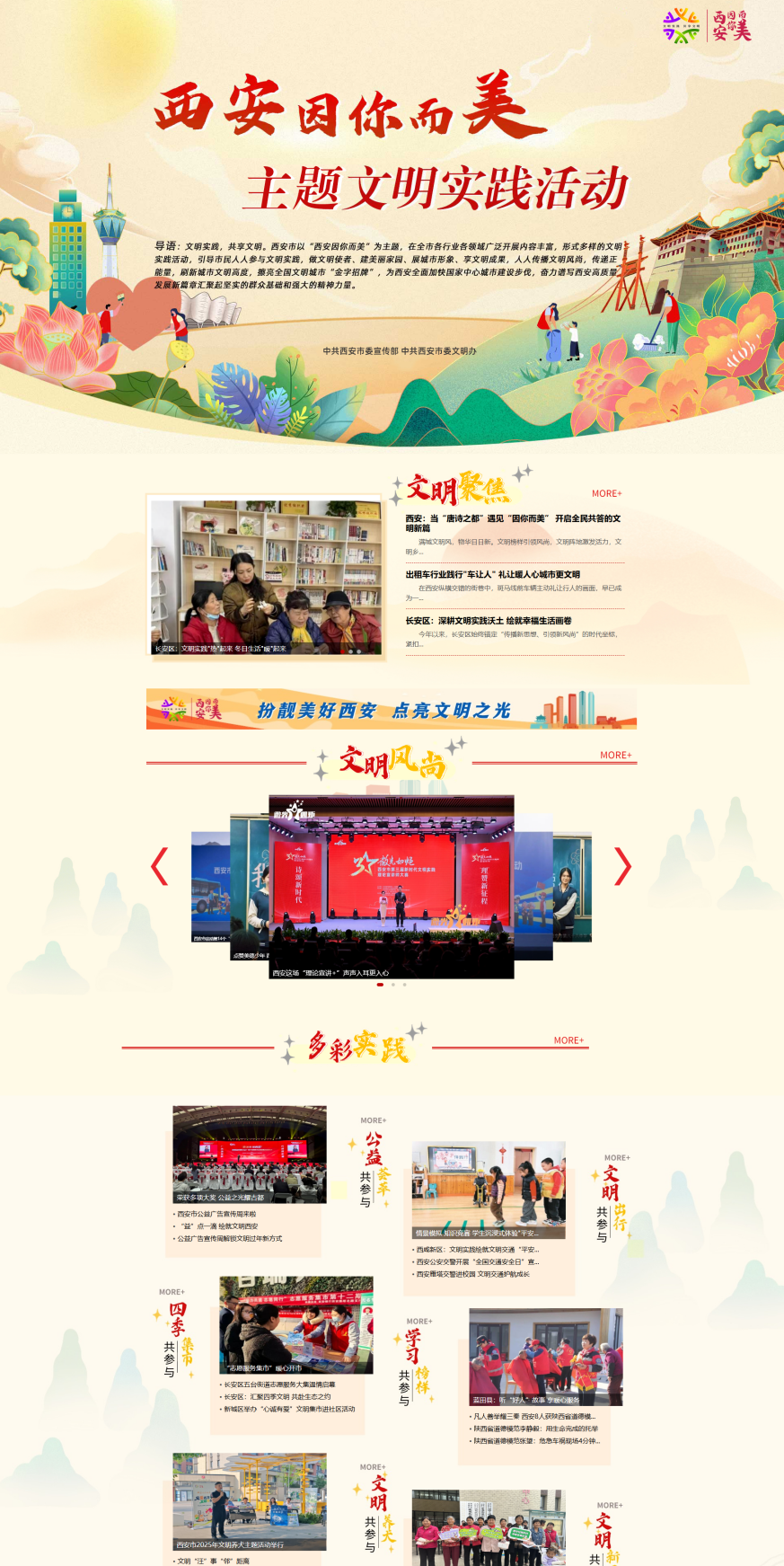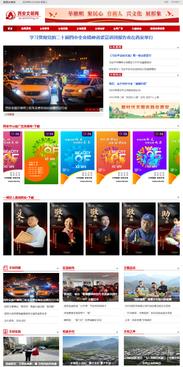 一直以来,西安文明网充分发挥全市精神文明建设门户网站权威平台作用,聚焦“西安因你而美”主题文明实践活动、“秦人之星”道德典型宣讲、“乡风文明·美在西安”“微光如炬”等重大主题,推出图文并茂的专题报道,让西安的文明故事在云端流淌;积极联动全市精神文明建设战线,全年开展“红心向党庆七一”“缤纷暑假 文明同行”等48场聚人气、强共鸣的网络文明传播活动,吸引超500万人次参与互动,有效构筑网上正能量舆论场,清朗网络空间与美好现实生活同频共振。