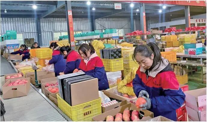 3月12日,在洛川县凤栖镇苹果产业园区,陕西顶端果业科技有限公司智能分选车间的工人在打包苹果。