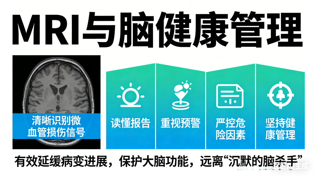 颅脑MRI是目前诊断脑小血管病的首选且最核心的检查手段,可被视为临床诊断的“金标准”。MRI能清晰识别微血管损伤的各类影像信号。读懂报告、重视预警、严控危险因素、坚持健康管理,就能有效延缓病变进展,保护大脑功能,远离“沉默的脑杀手”。