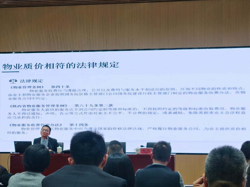 会议邀请了中国物业管理协会法律政策专业委员会副秘书长、北京高文(西安)律师事务所高级合伙人马小方对与会人员进行了培训授课。浐灞国际港住建局物业组全体工作人员,新筑、新合街道物业管理科室负责人,各社区主任及物业管理人员等共计140余人参会。