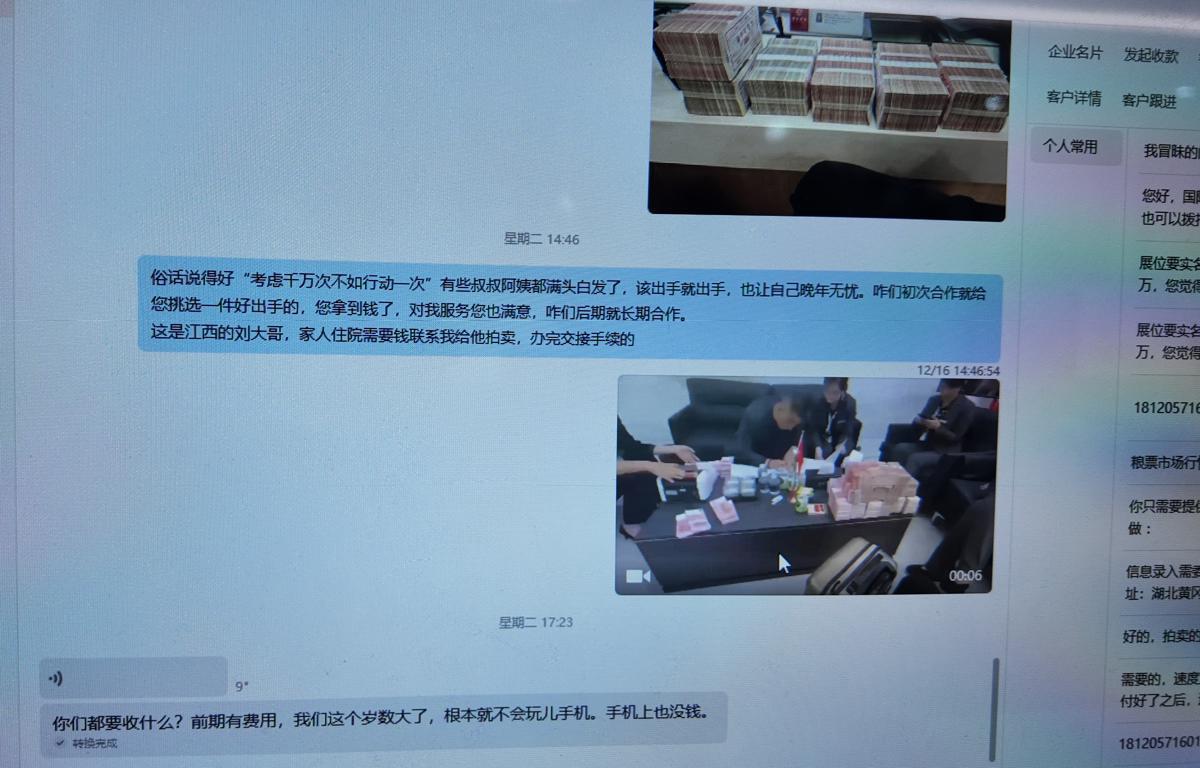 李阿姨并不知道的是,这些其实都是骗子的谎言。骗子会在网上找一张类似粮票的成交记录,用AI软件生成评估内容,稍作修改后,当作“专业意见”发给客户。他们还给客户发去大量现金照片截图,虚构成交案例,刻意营造“藏品一经委托就能高价拍出”的假象。