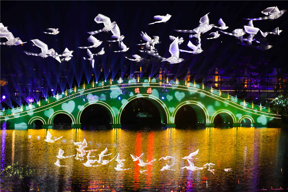 鹊桥凌波含情脉脉,汉堤锁烟芳草离离。 池泮亭台灿如霞帔,桥边津渡焕若列星。