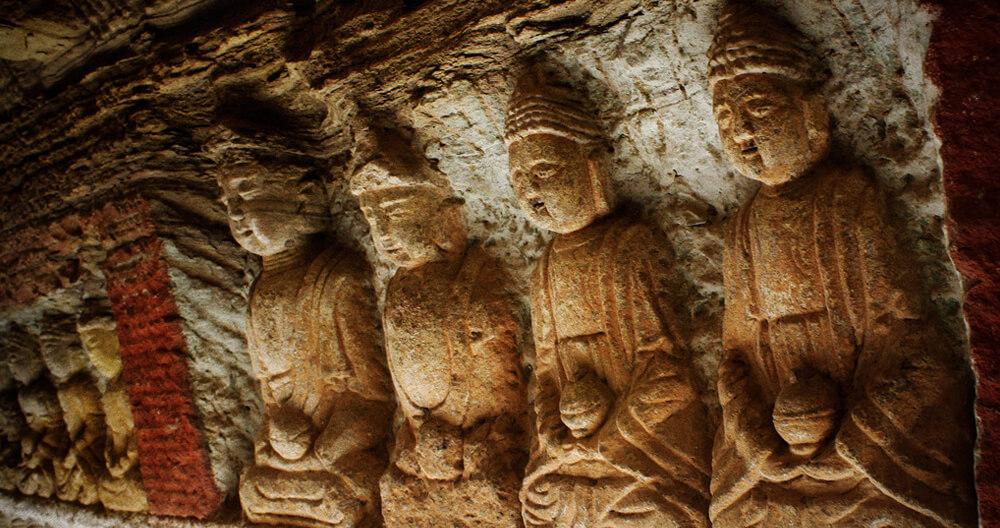 神木高家堡石窟沿山势而开凿,如今石窟千佛洞的洞门已经坍塌,佛洞也只留下半截的佛洞,外边的一截已坍塌成了山体,只留下靠里边的半截洞体。但洞内壁上雕刻的佛像依稀可见,千佛洞的左右两侧的墙壁上全是雕刻的石佛,只是因时间的原因风化的比较严重。