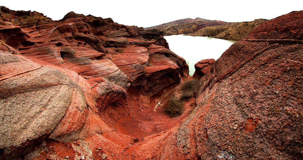 中鸡丹霞地貌位于陕西省神木市公格尔沟的波浪谷,丹霞是指红色砂砾岩经长期风化剥离和流水侵蚀,形成的孤立的山峰和陡峭的奇岩怪石,这里的丹霞地貌约10平方公里,东起敖包梁山脉,西至田家梁山脉,南起呼家梁山脉,北至大红渠山脉。梁峁起伏,沟壑纵横,不时裸露出大片红色的岩石;沟壑里,两边蜿蜒高耸的也大多是红石崖。在水库的东侧,一大片形态多样、色彩丰富的奇特地貌,错落交替的石头层层叠叠、有序排列,以红色为主色,还有淡红、紫红等颜色,在碧水蓝天的映衬下,色彩缤纷,如诗如画,令人不得不感叹大自然的鬼斧神工。
