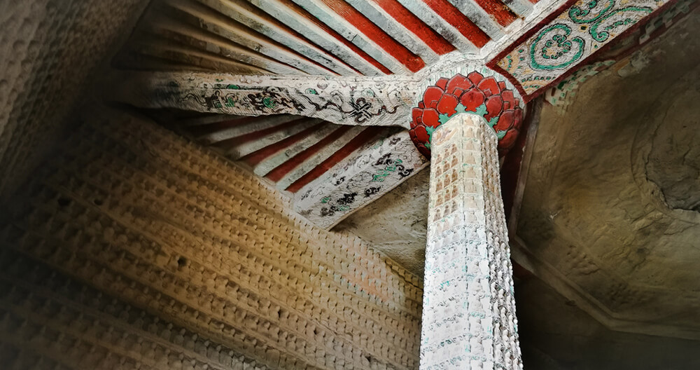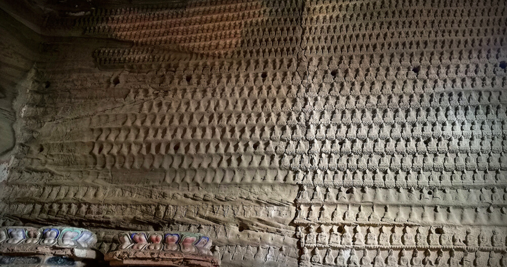 万佛洞是一层结构且非常宽阔的佛洞,中间雕琢出两根高大的方形石柱,貌似两石根柱子在支撑着这个偌大的佛洞顶部,石柱的四周也都雕刻满是佛像,佛洞的石柱和屋顶的颜色非常的鲜艳,佛像都已风化坍塌,右侧洞壁上佛像完好。