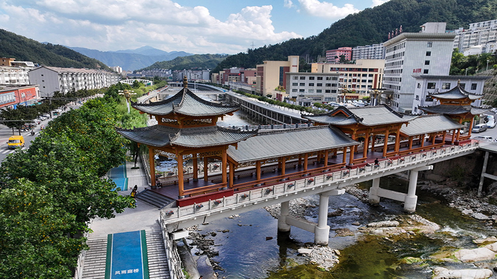 柞水县乾佑河畔的健身步道和风雨廊桥,古朴典雅,成为县城一道风景。